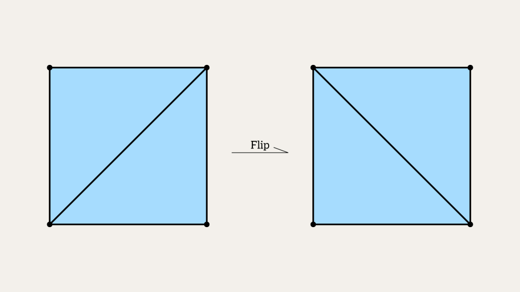 The undo operation for a flip, which might look identical to the redo, generally doesn’t work. It’s logical to assume that the reverse operation for a flip should be the flip itself since the operation is symmetric. However, this idea fails because, during the incremental application of patches, the direct use of flip in undo can create connections to other half-edges. These connections may then affect subsequent data dependencies in the transaction stack.