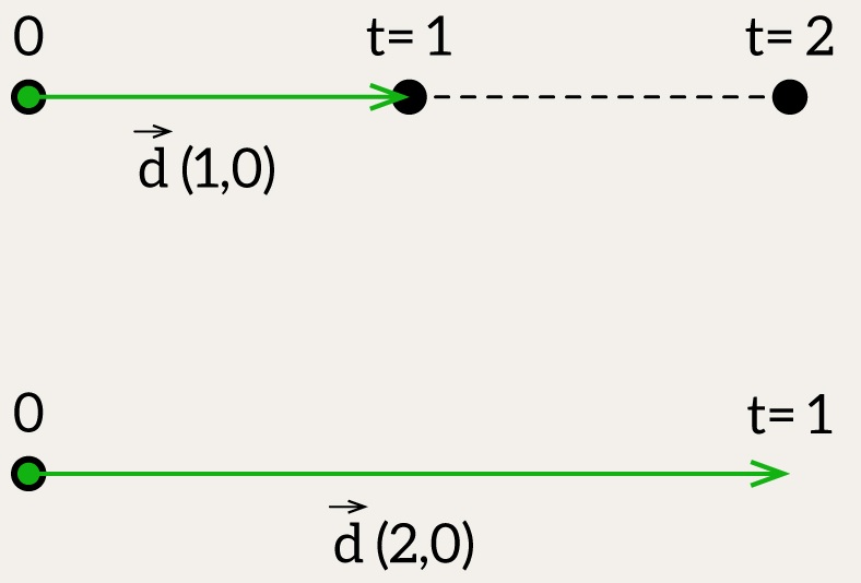 t = 1→(origin + (2, 0, 0))t = 2→(origin + (4, 0, 0))